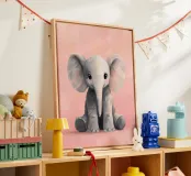 A peaceful baby elephant sits quietly, its large ears gently curved and its eyes full of innocence. Surrounded by a soft pink haze, the scene radiates warmth, tenderness, and a subtle touch of whimsy. Every brushstroke captures the calm spirit of childhood, where silence speaks and sweetness lingers.