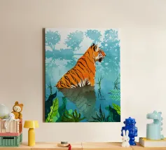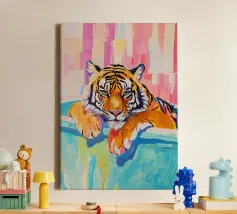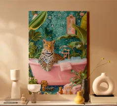 Tiger in a bath tub relaxing illustration whimsical decor art poster for bathroom. Colorful floral accents and dreamy vibes for a feminine relaxing energy. it an ideal accent for bathrooms, children’s rooms, nurseries, and creative spaces, adding a touch of personality, warmth, and visual delight.