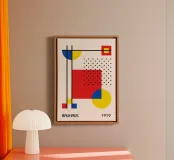A powerful digital poster celebrating the 1919 founding of Bauhaus. The asymmetrical composition features an interplay of basic geometric shapes—squares, circles, and lines—in a vibrant primary color palette of red, blue, and yellow, plus black. Thick black lines impose a rigid structure, contrasting with the playful patterns of scattered black dots over the red and off-white areas. This piece perfectly embodies the experimental, functionalist aesthetic of Minimalist Modernism. This premium digital download boasts 7000x5000 pixels at 300 dpi, ensuring exceptional clarity and superior print qua