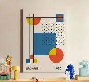 A powerful digital poster celebrating the 1919 founding of Bauhaus. The asymmetrical composition features an interplay of basic geometric shapes—squares, circles, and lines—in a vibrant primary-inspired color palette of red-orange, deep blue, and bright yellow. Thick black lines impose a rigid structure, contrasting with the playful patterns of scattered black dots over the blue and off-white areas. This piece perfectly embodies the experimental, functionalist aesthetic of Minimalist Modernism. This premium digital download boasts 7000x5000 pixels at 300 dpi, ensuring exceptional clarity and s