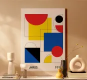 A dynamic digital poster celebrating the 1919 founding of Bauhaus. The abstract composition features an overlay and juxtaposition of basic geometric shapes—squares, circles, and semicircles—in the iconic primary color palette of red, blue, and yellow, plus black. Thin black lines add structural complexity, suggesting transparency and overlap, characteristic of the Minimalist Modernist aesthetic. This piece is a powerful example of functionalist design. This premium digital download boasts 7000x5000 pixels at 300 dpi, ensuring exceptional clarity and superior print quality for a large format pi