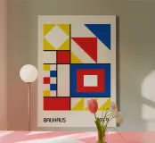 A highly complex digital poster celebrating the 1919 founding of Bauhaus, strongly inspired by De Stijl principles. The composition is a fragmented grid of squares and rectangles, filled with various geometric subdivisions like triangles and nested squares. The iconic primary color palette of red, blue, and yellow, plus white, creates a vibrant, structured, and visually engaging abstract piece. Thick black lines define the boundaries and structure, embodying the functionalist aesthetic of Minimalist Modernism. This premium digital download boasts 7000x5000 pixels at 300 dpi, ensuring exception