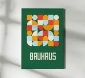 A stunning and richly colored abstract poster celebrating the core tenets of the Bauhaus movement. The composition features a complex, interlocking grid of squares, circles, semi-circles, and quadrants in a vibrant palette of bright orange, coral red, pale light blue, and cream. This intricate modular design is set against a bold, deep forest green background, maximizing the visual impact. The word "BAUHAUS" is prominently centered at the bottom in bold cream lettering. This high-resolution digital download (7000x5000 pixels, 300 dpi) ensures exceptional print quality and color saturation.