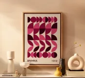A mesmerizing Bauhaus-style repeating pattern composed entirely of circles and semi-circles. This geometric print features a sophisticated grid design using a rich palette of hot pink, magenta, and deep wine red against a pale, creamy background. The rhythmic arrangement creates a striking visual impact characteristic of the modernist movement. This premium digital poster is offered in an outstanding 7000x5000 pixels, 300 dpi resolution, guaranteeing the highest quality and color fidelity for your modern interior decor.