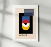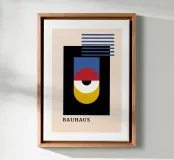 A stunning geometric abstraction that perfectly encapsulates the Bauhaus and Constructivism movements. This dynamic poster features a central, layered motif resembling an eye or target, composed of the primary colors—bold red, blue, and yellow—set against a stark black rectangle. The composition is accented by a series of floating horizontal blue stripes, showcasing a masterclass in balance and contrast. This vibrant and intellectual design is an ideal statement piece for Mid Century Modern, maximalist, or abstract art collectors who appreciate the purity of form and color. Text reads "BAUHAUS