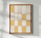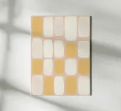 This artwork features a harmonious interplay of geometric shapes and soft colour fields in mustard yellow, pink and beige. Inspired by mid-century and boho styles, the result is a minimalist pattern with clear lines and fine symmetry. The calm colour palette lends the motif a warm, Scandinavian elegance.