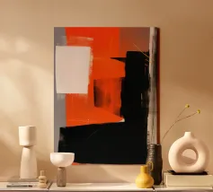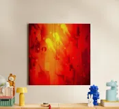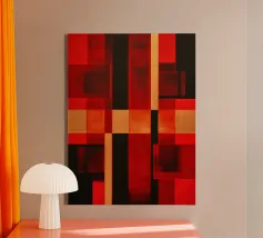 Bold abstract composition with vibrant red hues and dynamic canvas