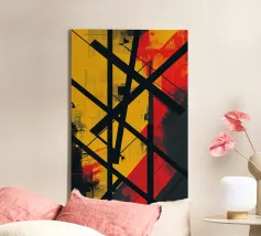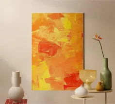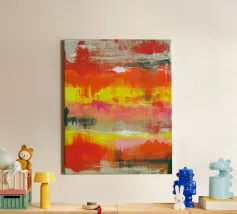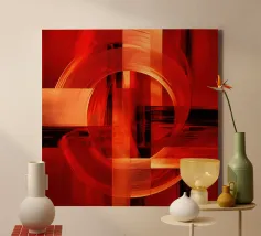 A captivating artwork displays vivid red tones mingled with bright circles and swirling lines. The abstract design evokes feelings of motion and intensity, perfect for any modern space.