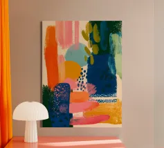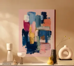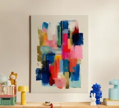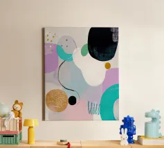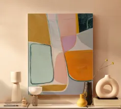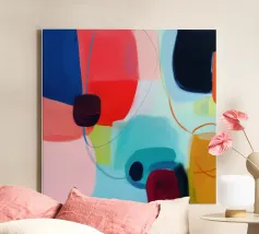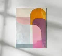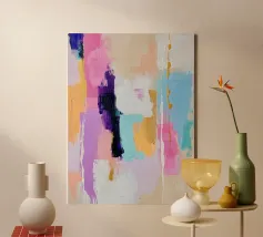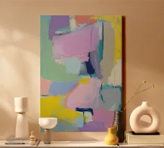 A vibrant abstract painting composed of bold color blocks, rounded shapes, and expressive brushstrokes in turquoise, magenta, mustard, pink, and soft lilac tones. The textured surface gives the piece a lively, handcrafted energy, while the balanced composition keeps it modern and stylish. Perfect for brightening contemporary interiors with color, movement, and personality.