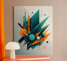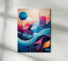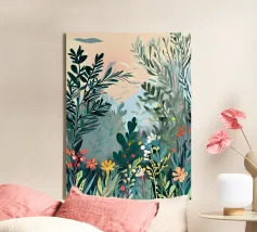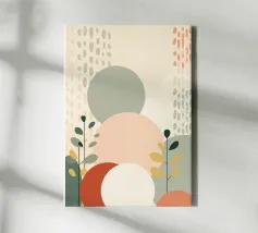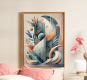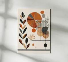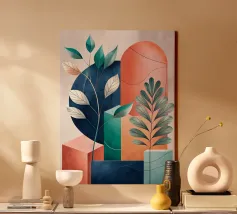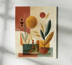 A captivating abstract artwork that blends organic and geometric elements. Lush foliage intertwines with celestial bodies and architectural forms, creating a sense of harmony and balance. The muted color palette and intricate details invite contemplation and exploration.