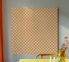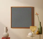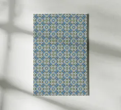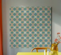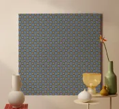 A repetitive pattern featuring squares with a geometric design fills the space, each containing a central motif with sweeping, curved lines. The color palette is primarily blue and brown, creating a visually rhythmic and consistent arrangement.