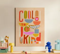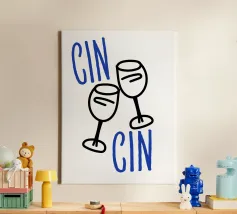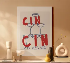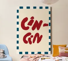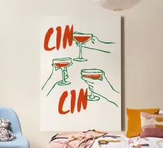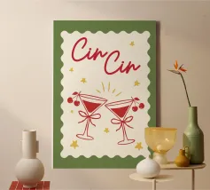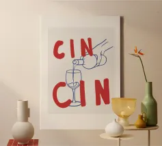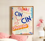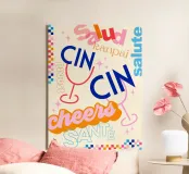 Raise a glass with this joyful and retro-inspired artwork celebrating global toasts! Featuring the word “Cheers” in a mix of vibrant languages Cin Cin, Kanpai, Salute, Proost, Salud this colourful design is set in a bold palette of bright blue, red, pink, and orange on a soft ivory background. Decorative details like stars, colourful checkered borders, and two minimalist wine glasses in keyline style add a playful vintage twist. Perfect for kitchens, bars, cocktail corners, or even recipe books and tea towels, this piece brings good vibes, good company, and a splash for good times!