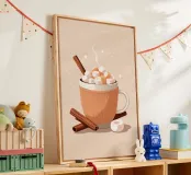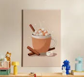 A cozy flat illustration of a mug wrapped in a knitted sleeve, topped with marshmallows and cinnamon sticks. A perfect piece to bring warmth and sweetness to any kitchen or café corner.