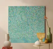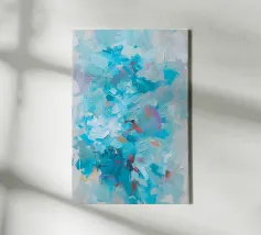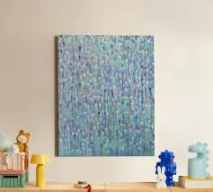 This image depicts an abstract painting characterized by a multitude of short, vertical brushstrokes in a variety of colors set against a soft blue background. The strokes create a textured and rhythmic surface that gives the impression of gentle movement or perhaps falling rain. There is a sense of depth created by the layering of paint, with hints of warmer tones peeking through cooler ones. The overall effect is calming and reminiscent of nature's elements, evoking feelings similar to watching light reflections on water or leaves rustling in the breeze.