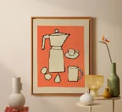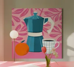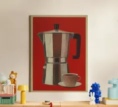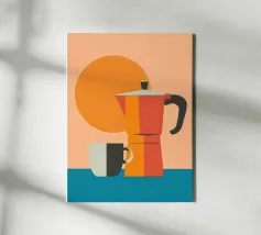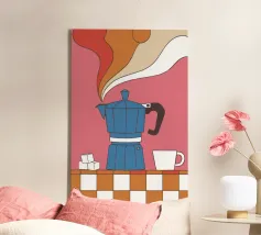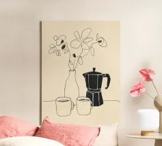 Infuse your kitchen with this minimalist 'Coffee Set' canvas art. Featuring a striking design of a coffee pot and cups, this piece brings a warm, inviting ambiance to your home. Perfect for coffee lovers and a delightful addition to your kitchen decor.