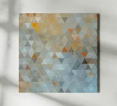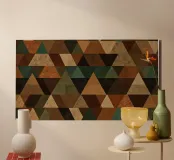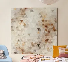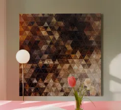 This artwork features an intricate arrangement of triangles in varying shades of brown, green, and cream, creating a visually striking and textured pattern.