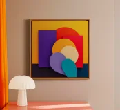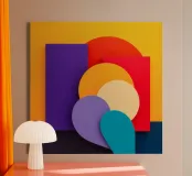 Vibrant geometric shapes in purple, red, yellow, and blue overlap against a bold yellow and dark background, showcasing abstract art with a modern flair.