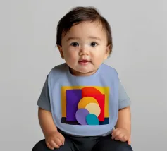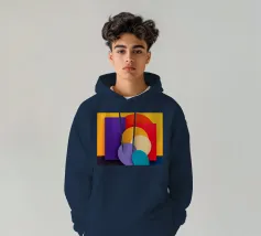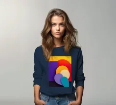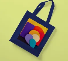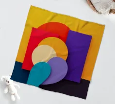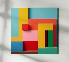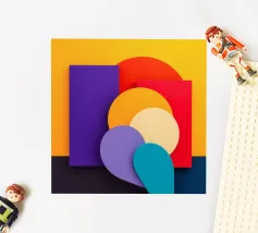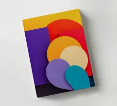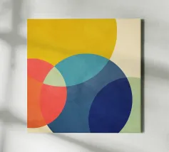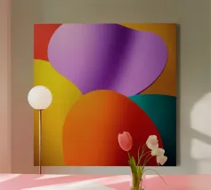 Vibrant geometric shapes in purple, red, yellow, and blue overlap against a bold yellow and dark background, showcasing abstract art with a modern flair.
