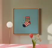 A vibrant sock illustration features bold stripes and colorful dots against a soft blue backdrop. The playful design showcases artful creativity and graphic elements, enhancing its appeal.