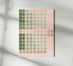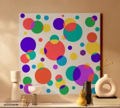 This fun, abstract digital artwork features a dense, random pattern of overlapping circles and dots. The mid-century modern inspired palette uses playful colors including coral pink, pale yellow, lime green, and deep teal against a cream background. The variety in size and color of the dots creates a joyful, confetti-like texture and dynamic visual rhythm. This lively pattern is ideal for adding a touch of retro charm and playful energy to a living room, office, or child's space. This high-quality digital poster (7000x5000 pixels, 300 dpi) ensures the vibrant colors are reproduced perfectly.
