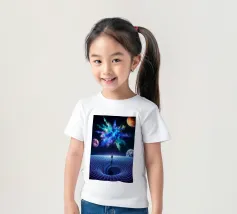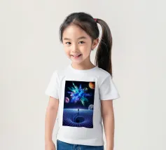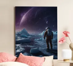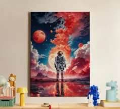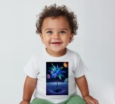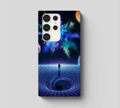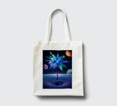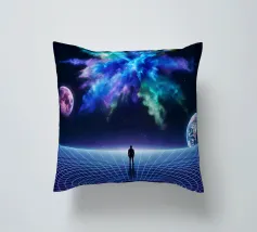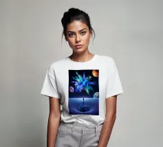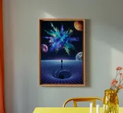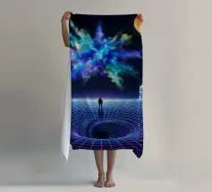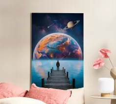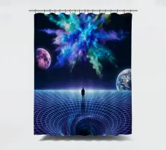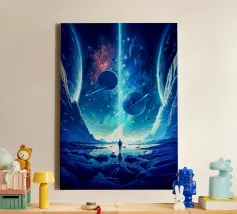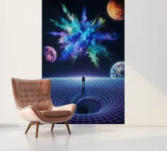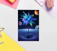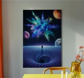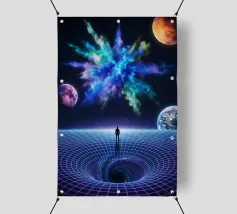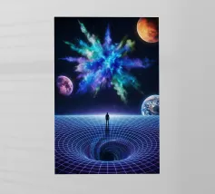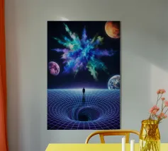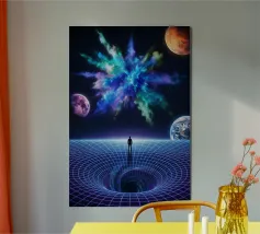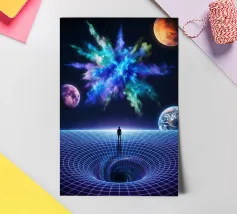 Immerse yourself in a breathtaking cosmic journey with this vibrant sci-fi artwork featuring a lone silhouette standing over a glowing space-time grid that spirals into a mesmerizing vortex. Above, an explosive nebula in dazzling blues, greens, and purples lights up the universe, surrounded by Earth, Mars, and a radiant moon. This design blends surrealism, astronomy, and futuristic geometry—perfect for dreamers, space lovers, and modern art collectors seeking a bold, inspirational statement piece.
