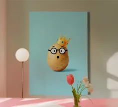 Cartoon illustration of a potato character wearing a cap, comfortably lounging on a green armchair against a vibrant orange background. The relaxed pose and expressive details convey humor and laziness in a lighthearted design.
