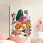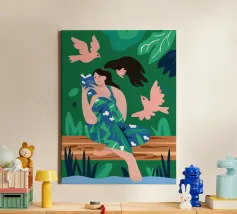 The painting shows a person with green hair, wearing a red polka dot top and orange pants, sitting on a colorful bed with various artistic elements around.