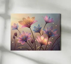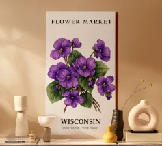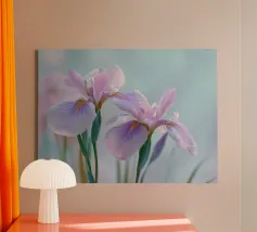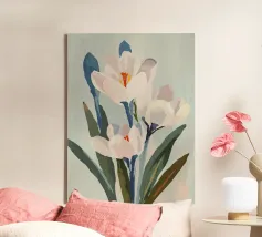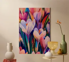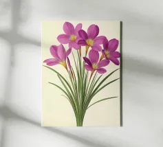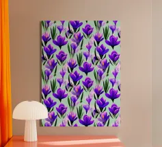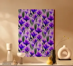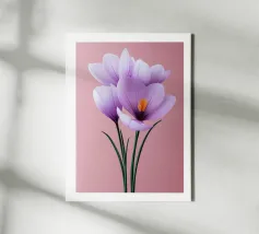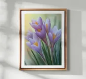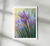 A detailed illustration of purple crocuses in full bloom with bright yellow pistils, capturing the subtle beauty of spring. Perfect for an elegant, natural wall decoration.