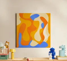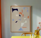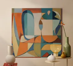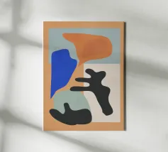 Abstract shapes and forms are arranged on a pale background, creating a composition that suggests a fragmented facial profile. Vivid colors such as blue, orange, and black are used for the geometric elements, contrasting with the subtle backdrop.