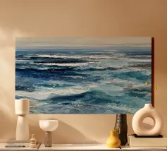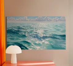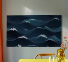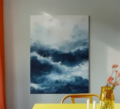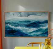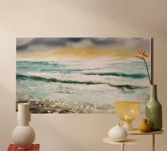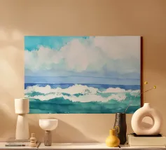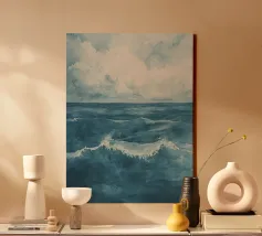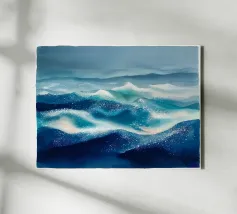 A brooding seascape that captures the layered drama of waves rolling beneath a darkening sky. This watercolor paints a cinematic view of nature’s energy and mystery, balancing turbulence with tonal elegance.
