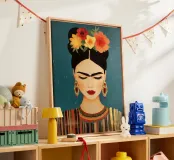 Expressive portrait in the Frida Kahlo style with a modern interpretation. The stylised depiction shows the striking facial features with a characteristic floral wreath of warm orange tones and vibrant red on a deep blue background. Golden earrings and the textured, striped clothing add depth and elegance to the motif. The minimalist, graphic imagery combines Mexican folk art with contemporary design - a powerful symbol of female strength and creative self-expression for self-confident, feminine living spaces and work environments.