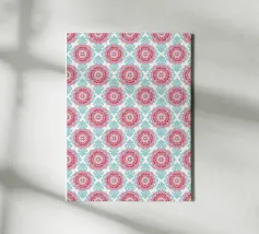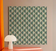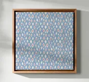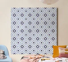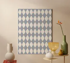 A repeating pattern features diamond shapes in soft pink and white against a light blue background, creating a geometric design. The arrangement of the shapes provides a sense of rhythm and harmony.