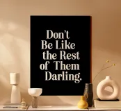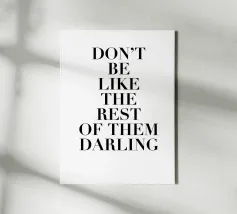Elevate your space with this striking Coco Chanel typography art print. The iconic phrase "Don't Be Like the Rest of Them Darling" is elegantly rendered in vintage white serif lettering, creating a bold contrast against a solid black background. This timeless design captures Chanel's spirit of individuality and style, perfect for adding a touch of sophistication to any room. Ideal for fashion enthusiasts, empowered individuals, or anyone who appreciates classic elegance with a modern twist. Let this print inspire you to embrace your uniqueness and stand out from the crowd.