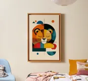 A peaceful lion cub dozes beneath a Bauhaus-inspired sky, wrapped in vibrant blocks of red, blue, yellow, and orange. This bold yet serene composition bridges the world of abstract design and gentle emotion, making it a perfect statement piece for nurseries, playrooms, or design-forward kids’ spaces.