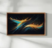 Vibrant and dynamic abstract design features swirling lines in orange and turquoise against a dark backdrop, perfect for use as wallpaper or digital art decoration.