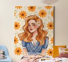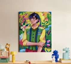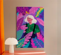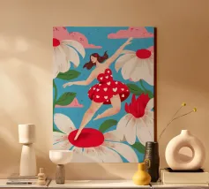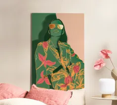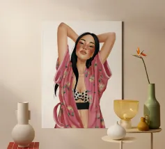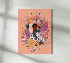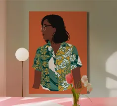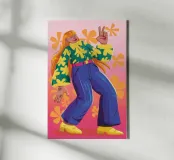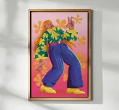 This artwork depicts a person in a vibrant yellow floral top and blue pants, striking a dynamic pose against a pink background with orange floral patterns.