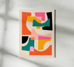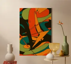 An energetic abstract composition where bold geometric shapes, lines, and patterns in orange, teal, and black collide and overlap, creating a sense of dynamic movement.