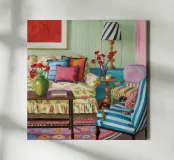 A vibrant, eclectic parlor filled with a mix of patterns and colors. A floral sofa, a striped armchair, and patterned wallpaper create a maximalist's dream, full of personality and creative energy.
