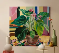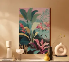 This artwork features a plant with long green leaves and pink flowers. The background consists of abstract shapes in pink and green, adding a touch of elegance to the botanical subject.