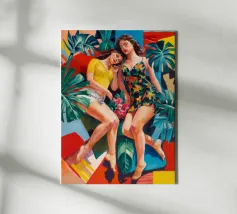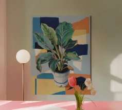 This artwork features a plant with long green leaves and pink flowers. The background consists of abstract shapes in pink and green, adding a touch of elegance to the botanical subject.