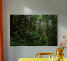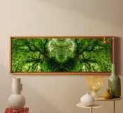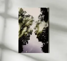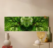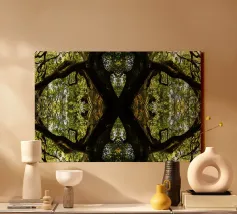 A close-up of a grand, ancient walnut tree’s lush green branches and leaves, captured and mirrored to create a symmetrical, horizontal composition. The mirrored effect transforms the natural scene into a majestic, almost otherworldly landscape, inviting the viewer into a parallel universe where nature’s grandeur feels infinite and surreal. This artwork is perfect for modern living rooms, creative studios, galleries, or cafes, adding a calm, inspiring, and sophisticated touch to any space.