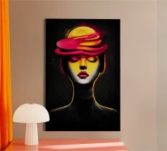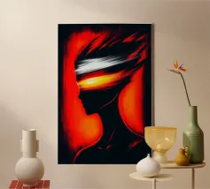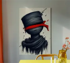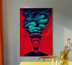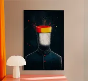 An enigmatic, faceless character in an elegant dark suit with red buttons stands in front of a deep black background. His head is replaced by an open, bright yellow-red bowl from which colours and energy spray into the darkness. The picture symbolises creative explosion, lost identity or the outburst of uncontrolled thoughts. The sharp contrasts and abstract style lend the artwork a mysterious yet expressive depth.