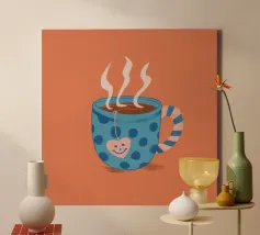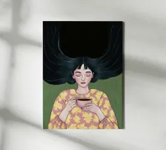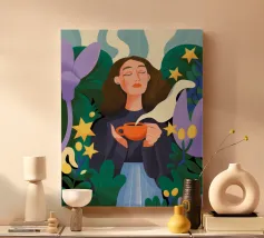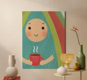 A calming illustration depicting a person with a gentle smile holding a warm cup of coffee.