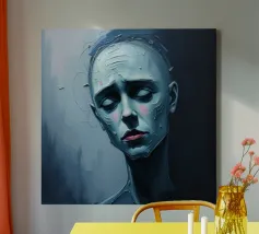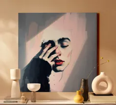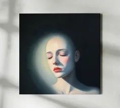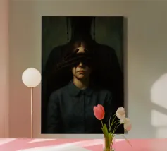Expression of vulnerability and contemplation in a dimly lit canvas