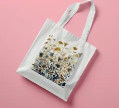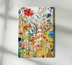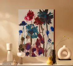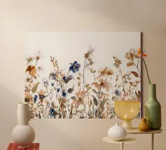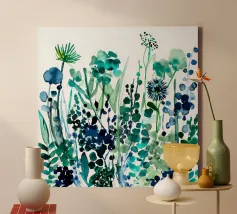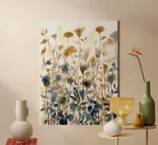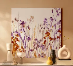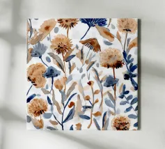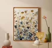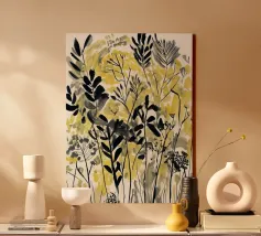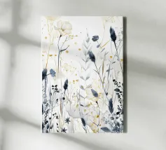 This atmospheric watercolor captures wildflowers silhouetted against soft, golden light. Loose brushstrokes and a palette of indigo, ochre, and taupe create a delicate balance between detail and abstraction.