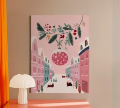 Pink Christmas Town Art Snowy Street Winter Illustration
