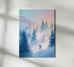 Snowboarder Riding Through Misty Pines in Winter Mountains