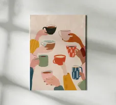 Friends Raising Coffee Cups In Warm Cozy Morning Light