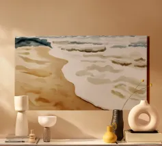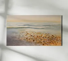 An overhead view of gentle surf meeting sand, rendered with layered washes of blue-gray and tan. The stippled foam patterns and soft tonal transitions capture the rhythm and texture of receding waves, balancing realism with graphic abstraction.