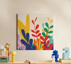 A vibrant, seamless pattern of stylized leaves and botanical shapes in a palette of red, blue, pink, and yellow, creating a sense of rhythmic, natural movement.